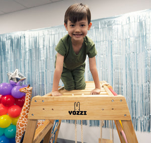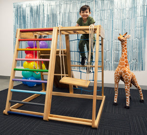 This Yozzi Indoor Gym Playground Climber Wooden Play set creates a perfect place for children to expand their imagination and stay busy for hours. Designed to complement any playgroup; Features a swing, slide, climbing rock wall ladder, and monkey bars. It combines safety, style, comfort, and fun; Great for all-year-round use.