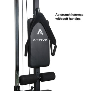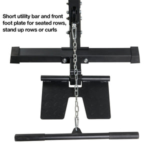 • Versatile. Includes Lat Bar and an adjustable Lower Utility T-Bar that offers a range of Lat, Shoulder, and Arm exercises. Includes double stitched harness strap with soft handles to perform seated ab crunches. Bar holder located at the top of the unit.