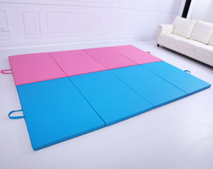 There is Velcro on all sides of the gymnastic mat. If you want to make a large workout area or tumbling run and securing a folded shape, it is easy to hook several mats together to suits your needs. And with a fordable, 4-panel design and handles, you will find it easy to store and transport them.