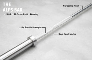 • The Knurling: Most bars, and even IWF competition standard bars have knurling in the middle of the bar. As the Alps bar is intended for training, this middle knurling has been remove to prevent excess wear and tear on the lifters clean position, helping to prevent injuries.