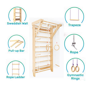Multi-function gym is made of natural wood which is very nice to the touch and warmly fits into almost any interior without disturbing the comfort of the home.